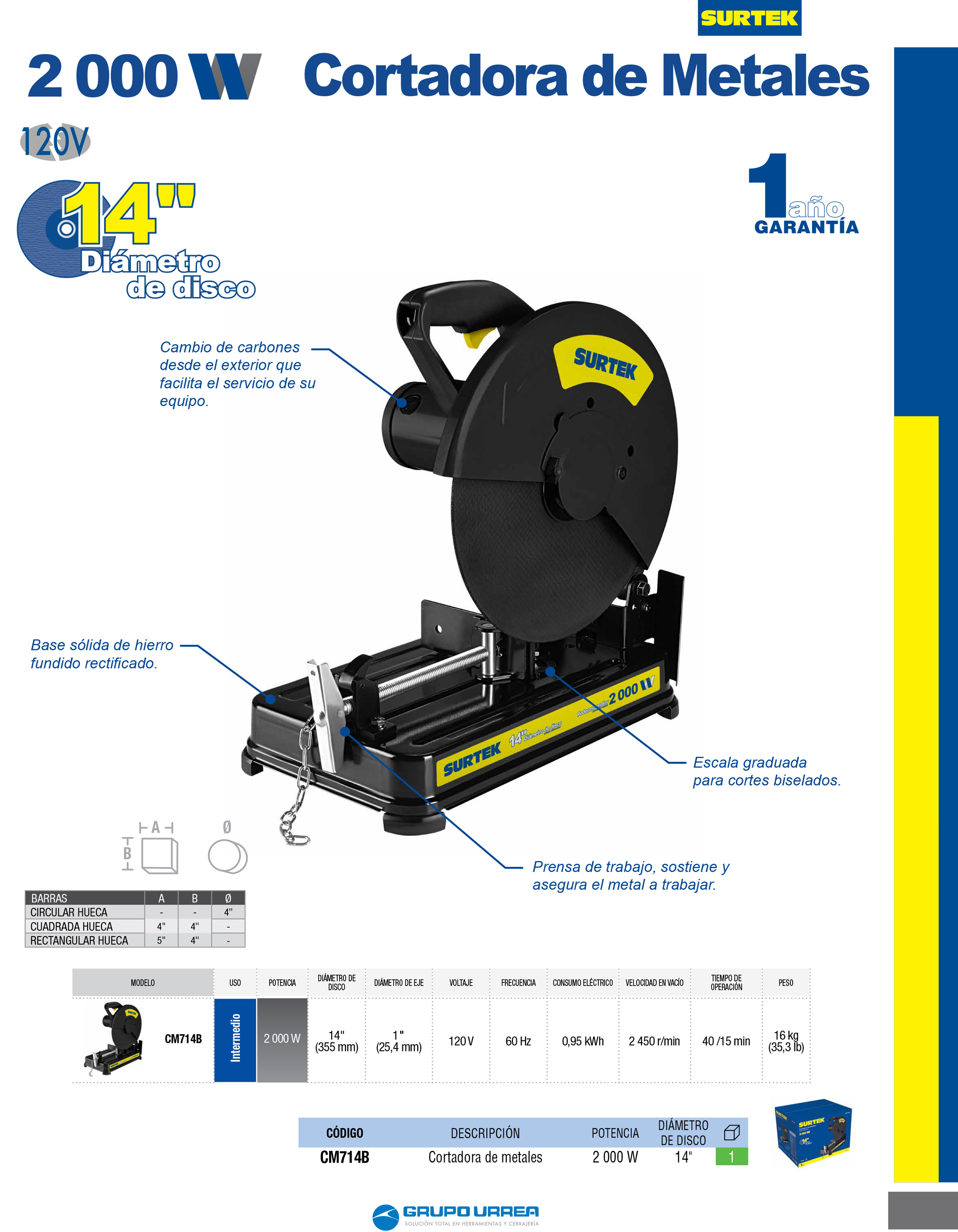 Cortadora de metales 14″ 2000 W 120 V, 3900 RPM Surtek