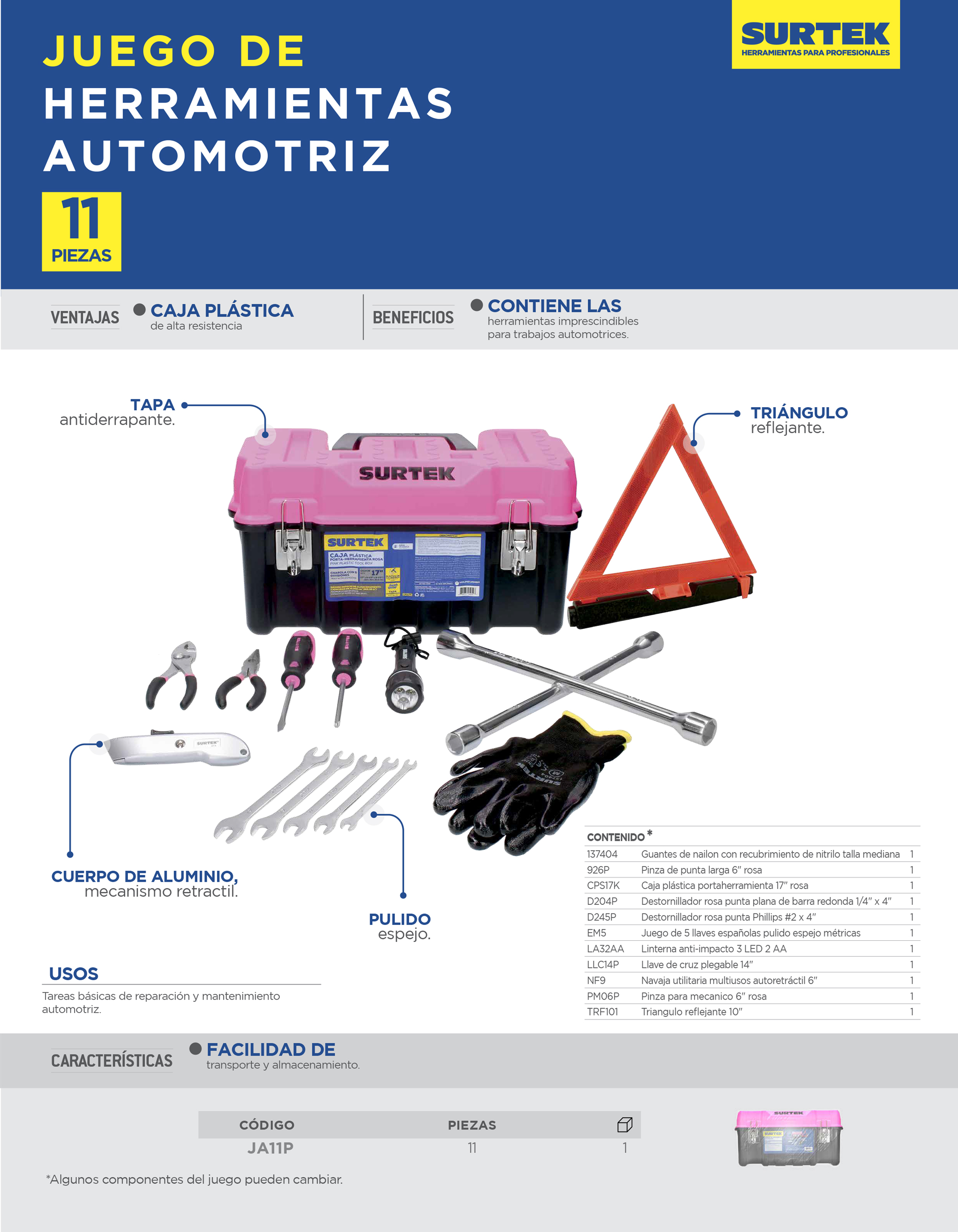 CPS17K Caja plastic 17x9x8″ Rosa 1pz. 137404 Guantes nailon c/nitrilo M 1pz. NF9 Navaja utilit automática 1pz. PM06P Pinza mecánico 6″ rosa 1pz. LA32AA Linterna anti impacto 3LED 2AA 1pz. LLC14P Llave de cruz plegable 14″ 1pz. D245P Destornillador rosa phillips#2 1/4×4″ 1pz. D204P Destornillador rosa plana redon1/4×4″ 1pz