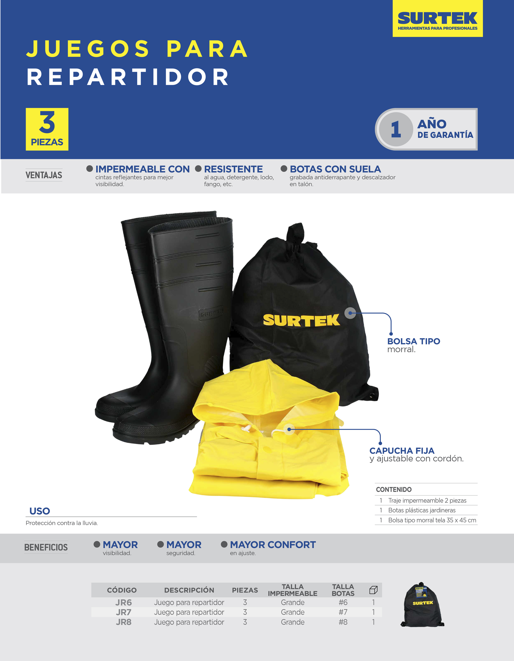 137617 – Traje impermeable grande – 1pz. 137566 – Botas jardineras mx#6 – 1pz. BOL01 – Bolsa tipo morral – 1pz.