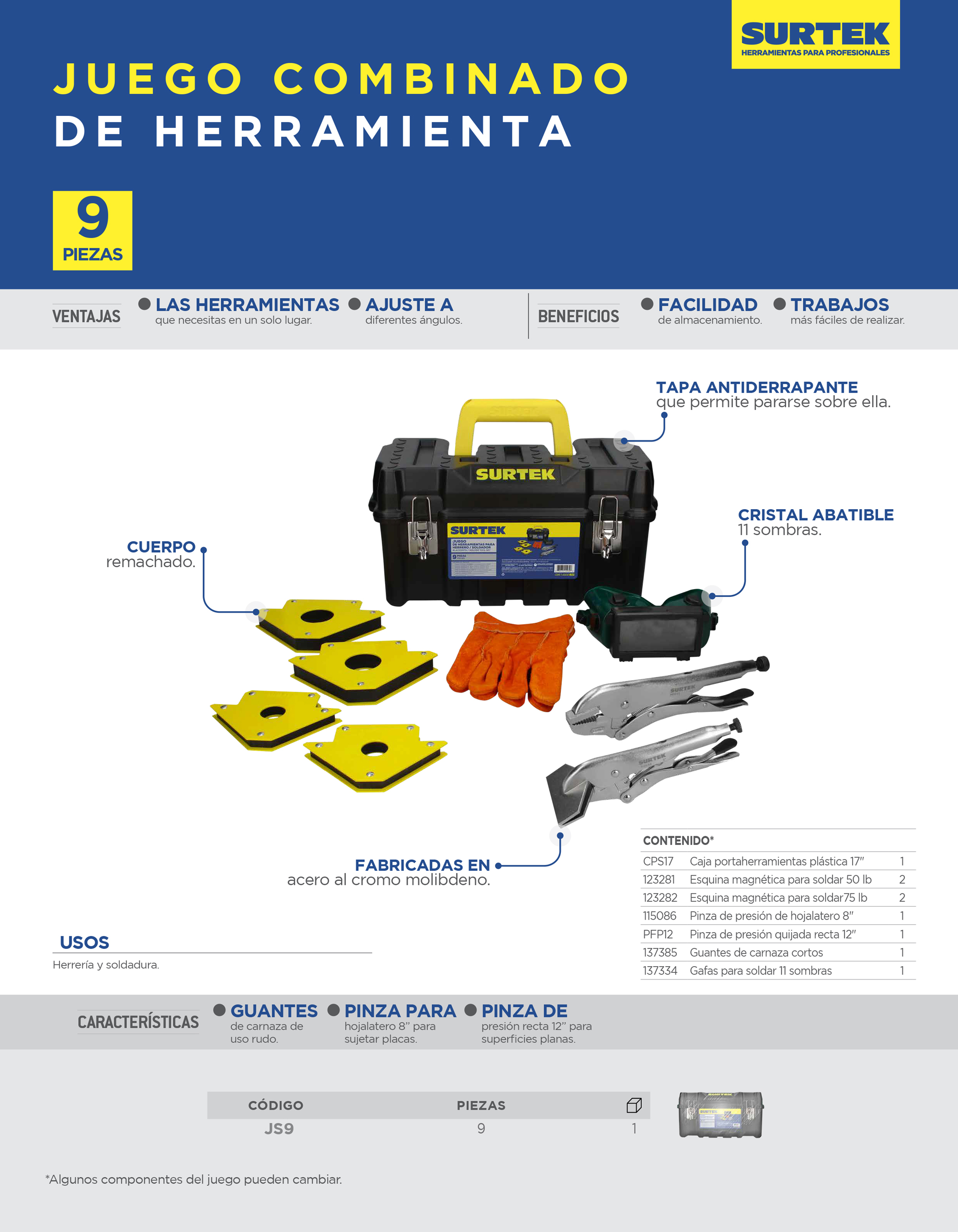 -Juego de herramientas para herrero/soldador. Esquinas magnéticas con cuerpos remachados para mayor duración y resistencia. Guantes de carnaza uso rudo. Pinzas para hojalatero 8″ para sujetar placas. Pinzas de presión recta 12″ para superficies planas, fabricadas en acero aleado, recubrimiento de cromo. Gafas 11 sombras con cristal abatible, diseño ergonómico. Caja plástica de 17″ con resistentes costillas de refuerzo. Bisagra corrida.