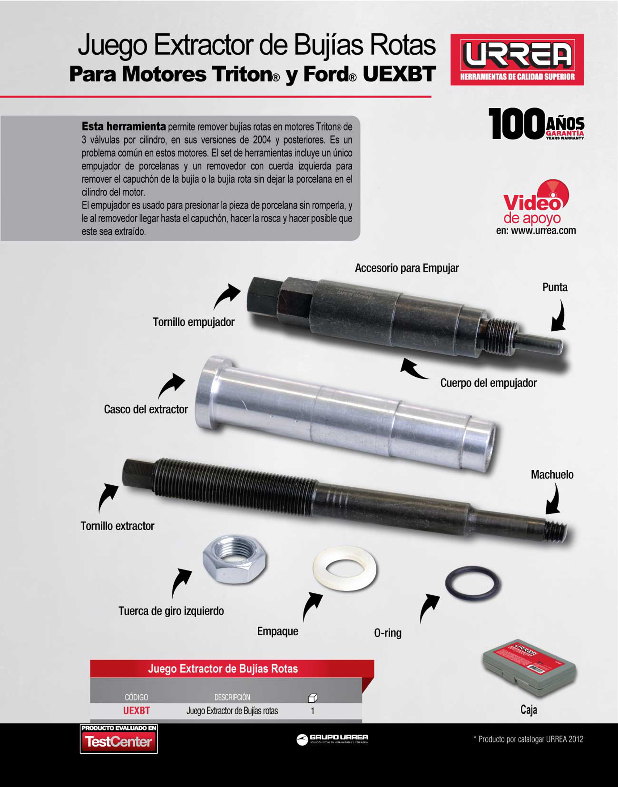 -Extractor de bujías rotas Ford® Urrea. -Remueve bujías rotas de motores tritón®, Ford®, en versiones 2004 y posteriores.