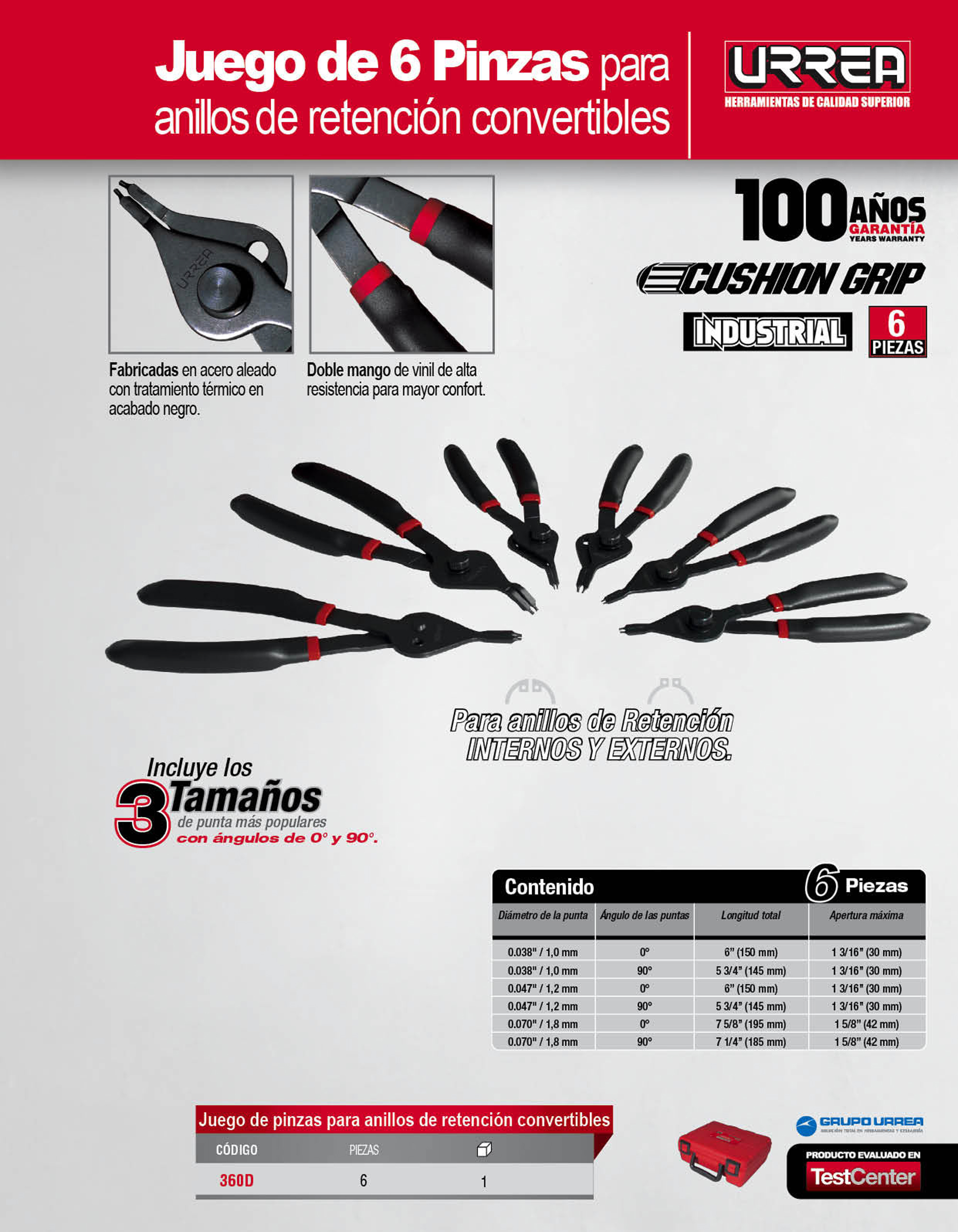 Juego 6 pinzas anillos de retención uso industrial Urrea