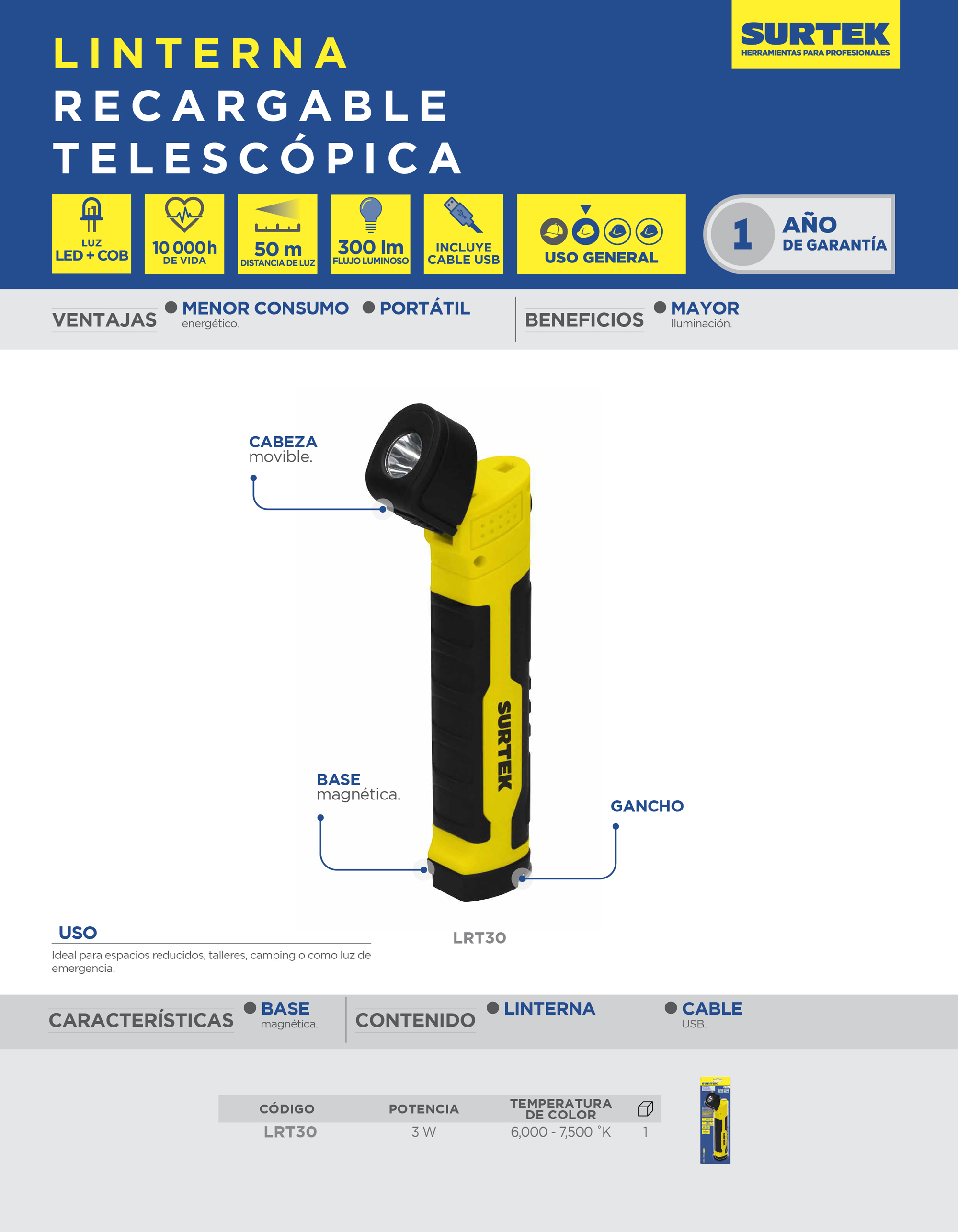 Linterna recargable telescópica 300 lm Surtek
