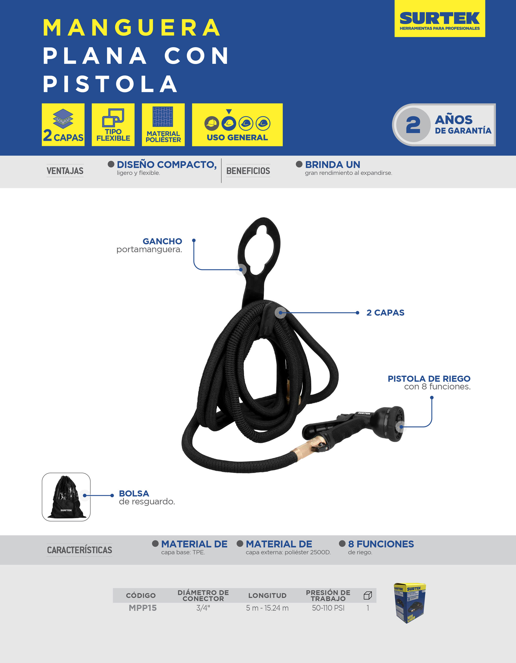 Manguera para jardín plana 3/4″ 15 m con pistola para riego Surtek