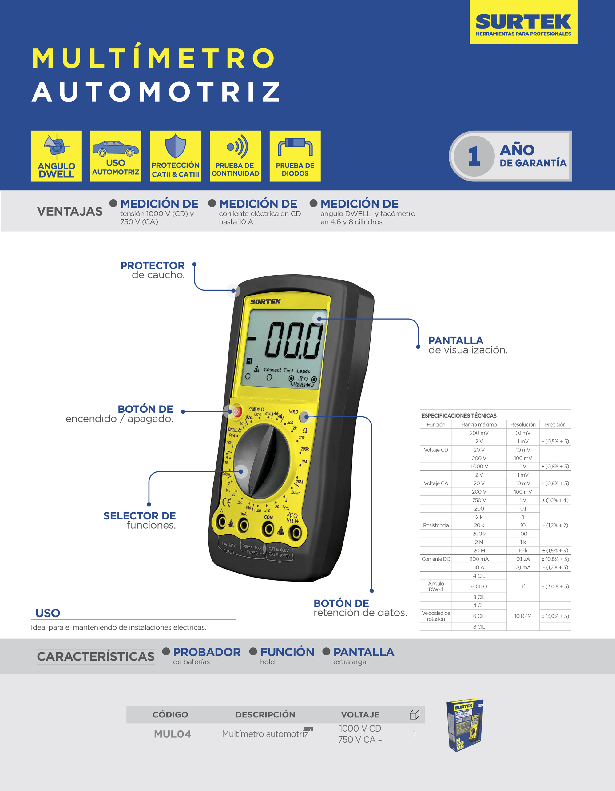 Multímetro automotriz 1000V, Instructivo de uso.