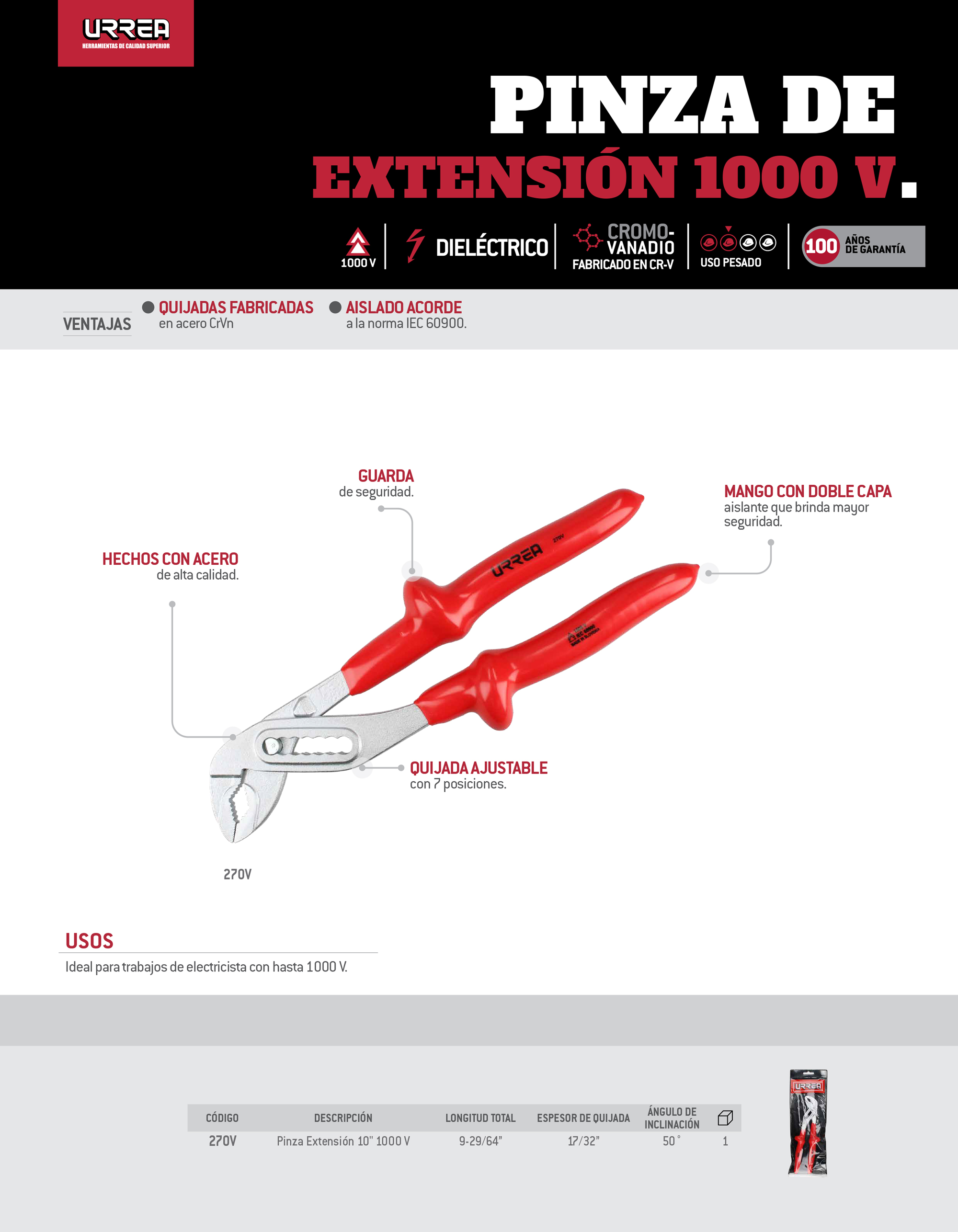 Pinza de extensión de 1000 V de 9-29/64″ quijada ajustable Urrea