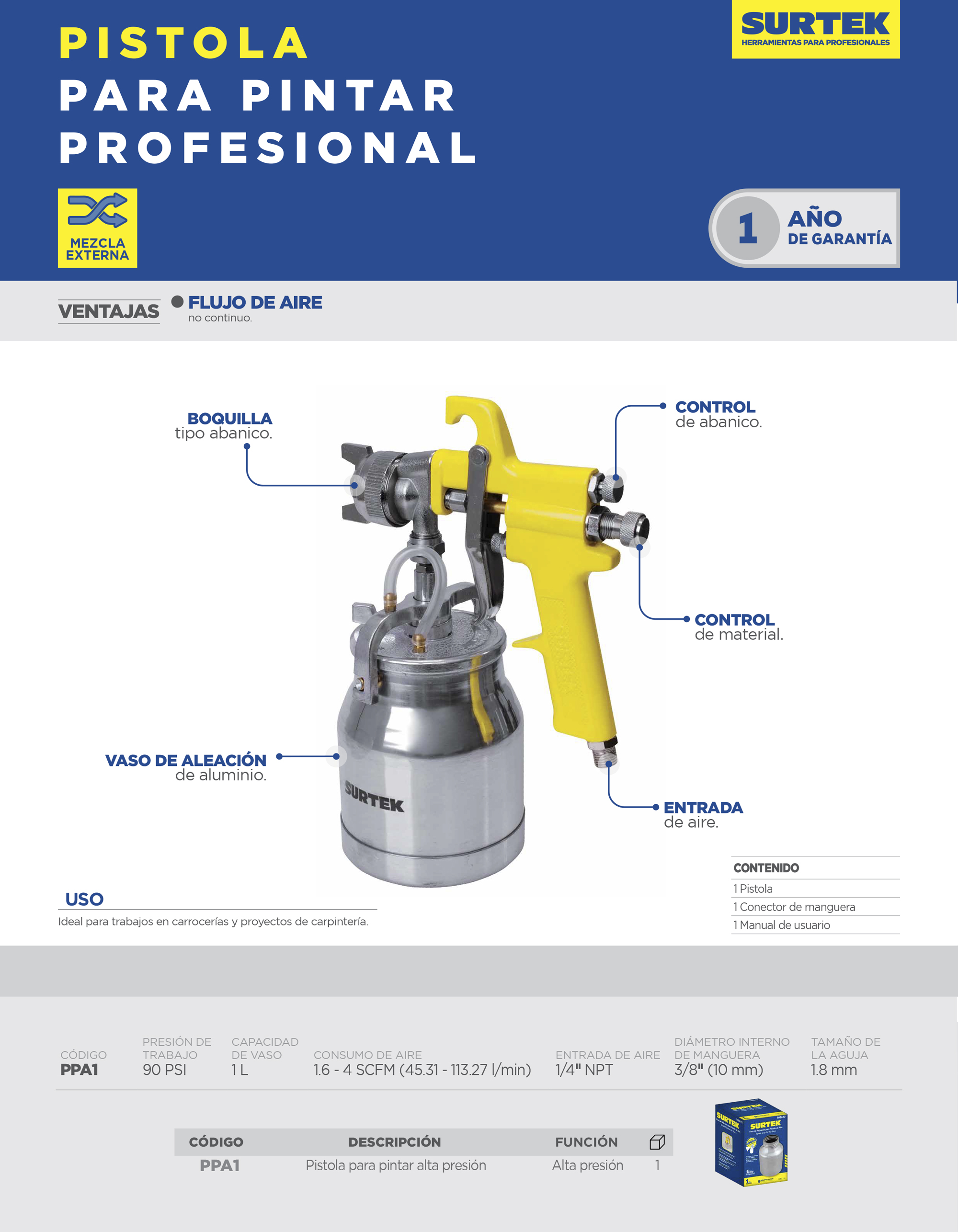 1 pistola, 1 conector de manguera, 1 manual de usuario.